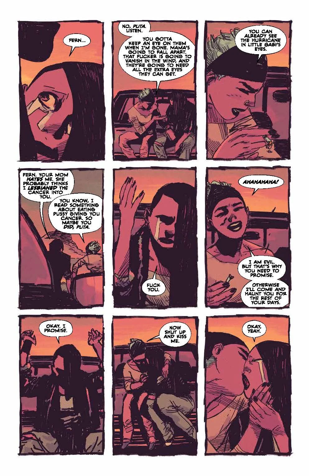 This issue opens up to a flashback with Riqui talking with her girlfriend Fernanda. Fernanda is dying of cancer. She makes Riqui promise to look after Gabi after she’s gone. It’s an emotional sequence that will hit readers pretty hard. From here, the story shifts to Riqui making plans to take Gabi and Erica to the police station for protection. Erica overhears this and throws in a counter offer to handle the monster. This doesn’t sit exactly well with Riqui, but a resolution happens as they both are unaware what lies ahead. Erica is not ready to fight anything in her current state but isn’t going to let the monster win. Erica knows Cutter is lurking but not sure what her play will be.