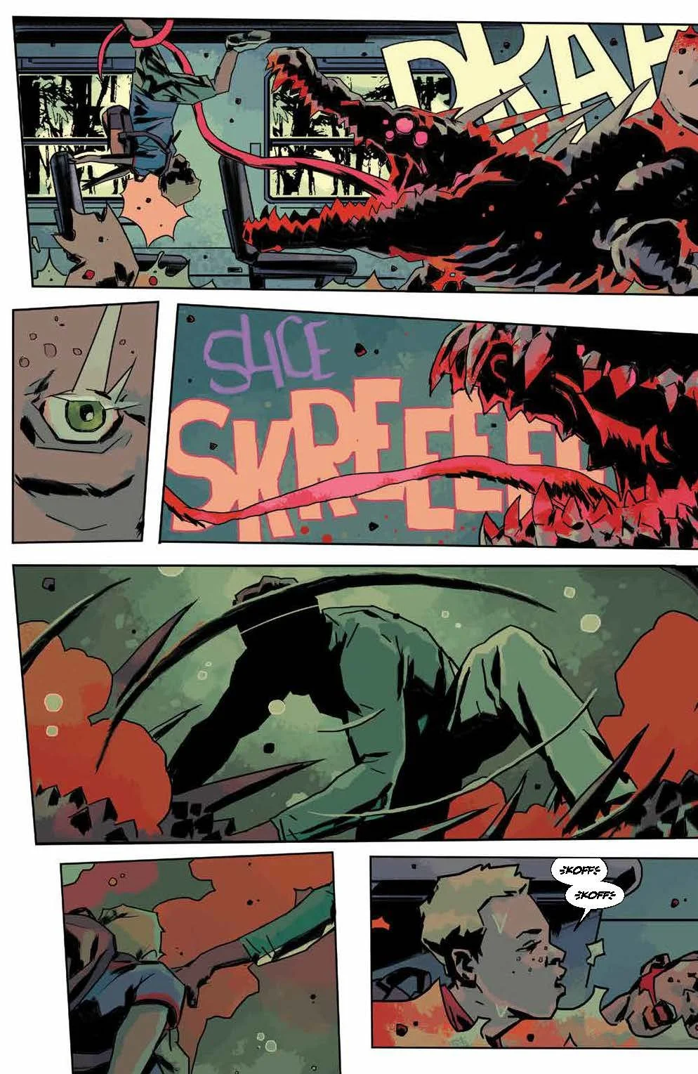 The art doesn’t shy away from the horror in which these characters live in. From the initial monster’s attack on the school bus, Fuso sets an early tempo of frightening drama. The monsters live up to the build of terrifying creatures and help to heighten the drama of the writing. The dream/flashback moments gave a nice break to the story. Seeing Jace’s self guilt play out was a huge add to the story. Dealing with his demons while trying to stop Sunny from falling into danger made for some great visuals. The final panel will raise some questions but like with every great beginning, readers don’t want to have all the answers right then and there. The whole SIKTC/House of Slaughter line does a slow burn build better than most comics. This issue is no exception.